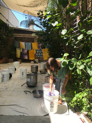 After creating our bundled fabrics, which in this case were natural pillow cases provided by the Buffy team, we went dying. Gloves on and bundles pre-treated we got the chance to literally immerse ourselves into the buckets of natural dye and watch the magic happen.