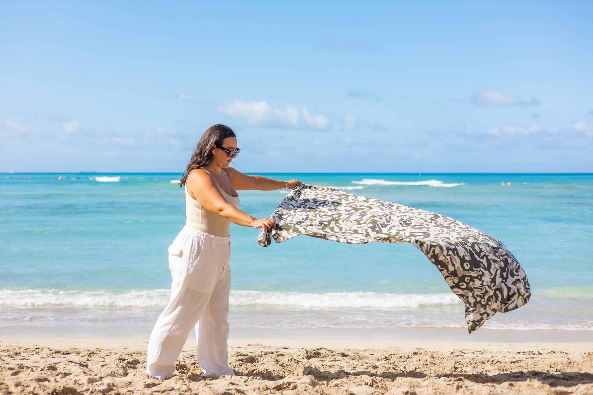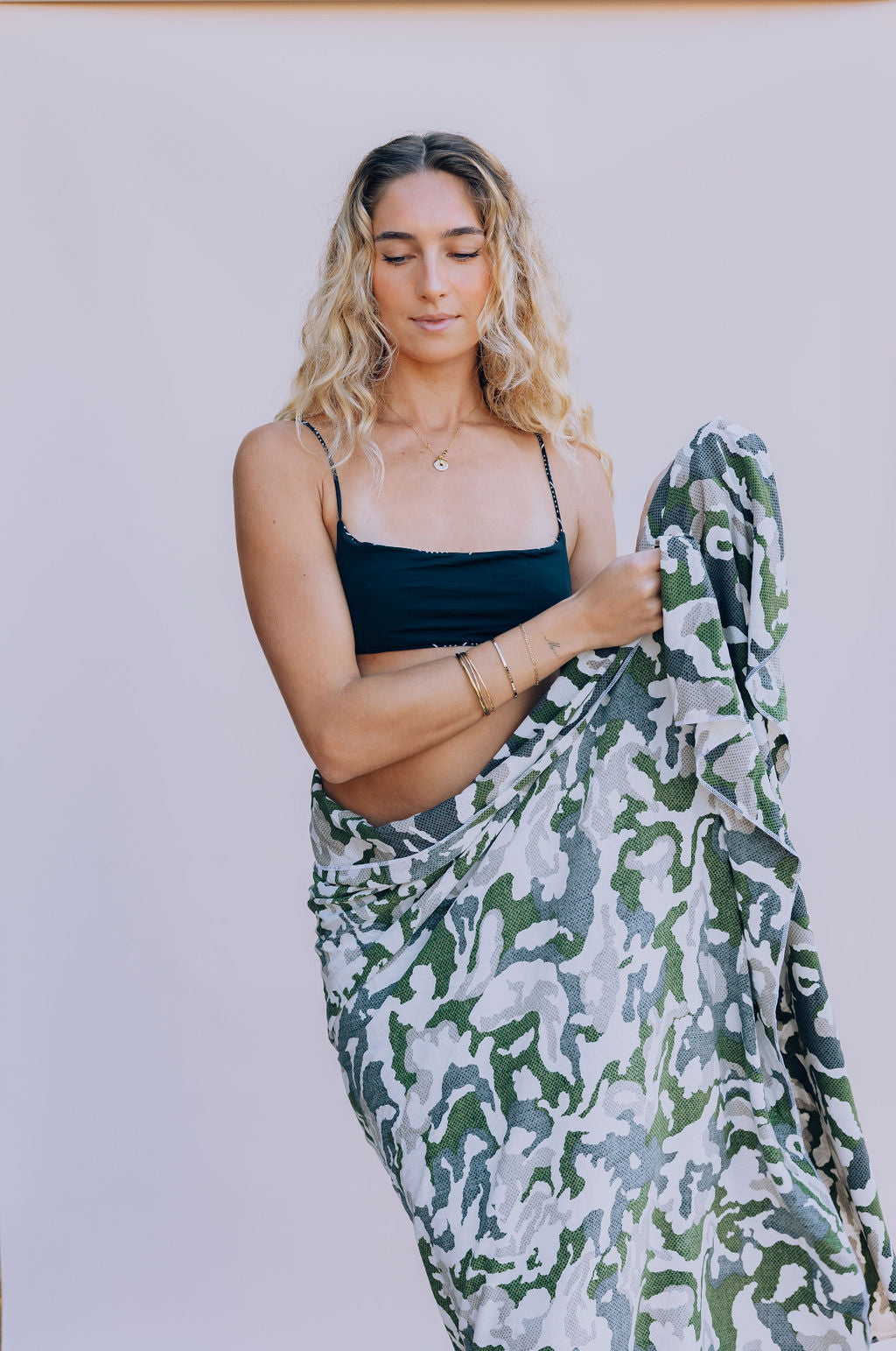 We've made these pareos the right size for you to use all the time. Whether you want to use this item traditionally as a sarong/coverup. Long enough to wrap around your waist and become a long maxi skirt. Wide enough to use as a beach blanket. Or get creative and learn to fold and tie it up as a halter top. This stunning neutral camouflage print is 100% upcycled and was saved from the trash and upcycled into this amazing pareo just for you!