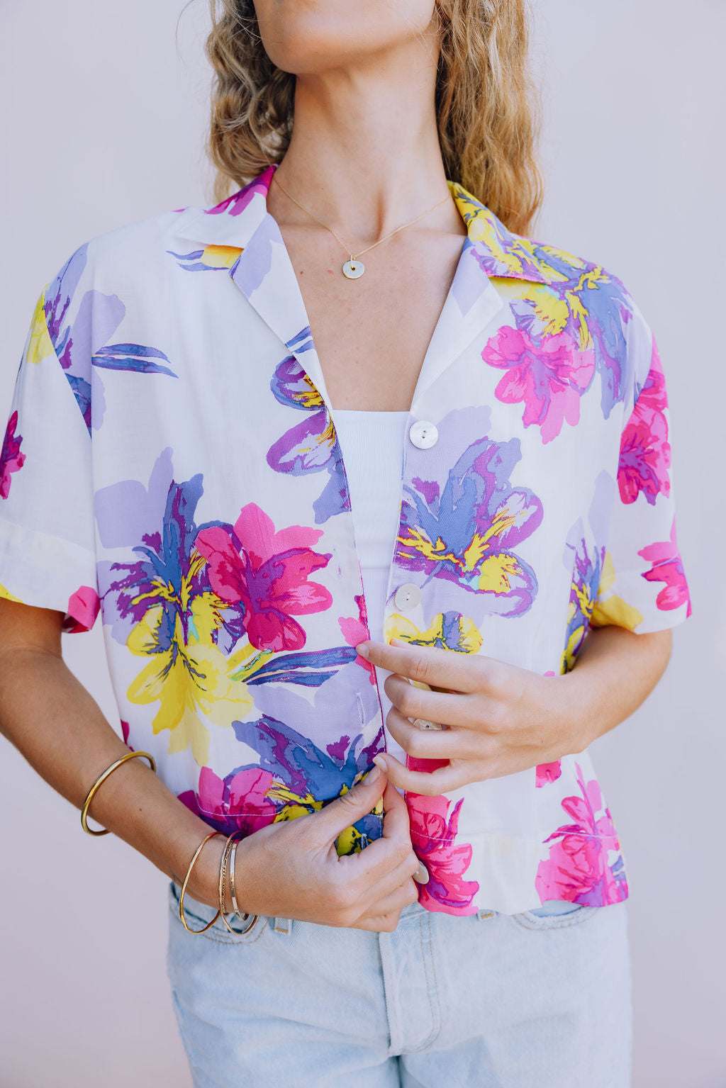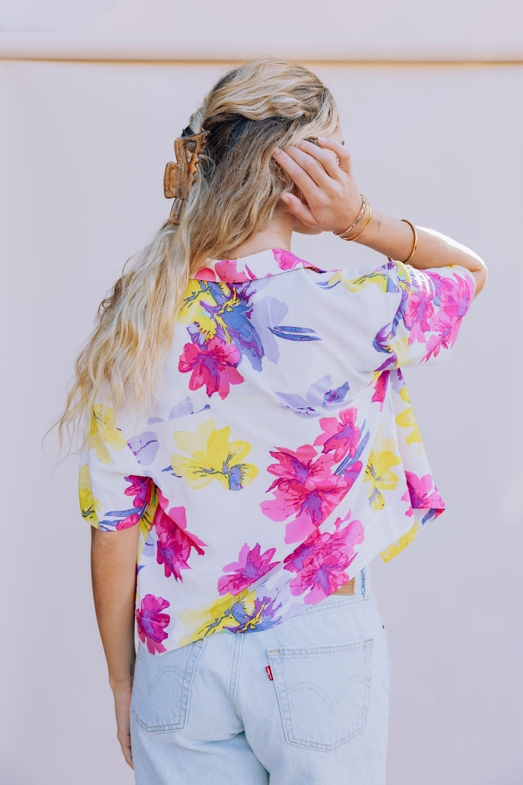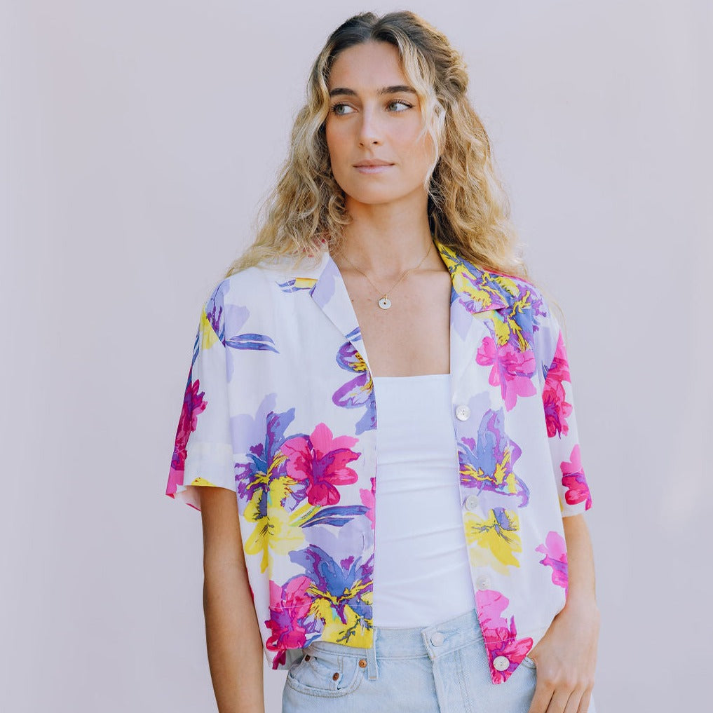 Be bright, vibrant and bold with our newest upcycled print, Retro Bloom. This fun floral design features bright pinks and neon yellows. The perfect fun summer shirt! Wear buttoned up with your favorite pair of denim or try unbuttoning it over a tank or dress for a layered look.