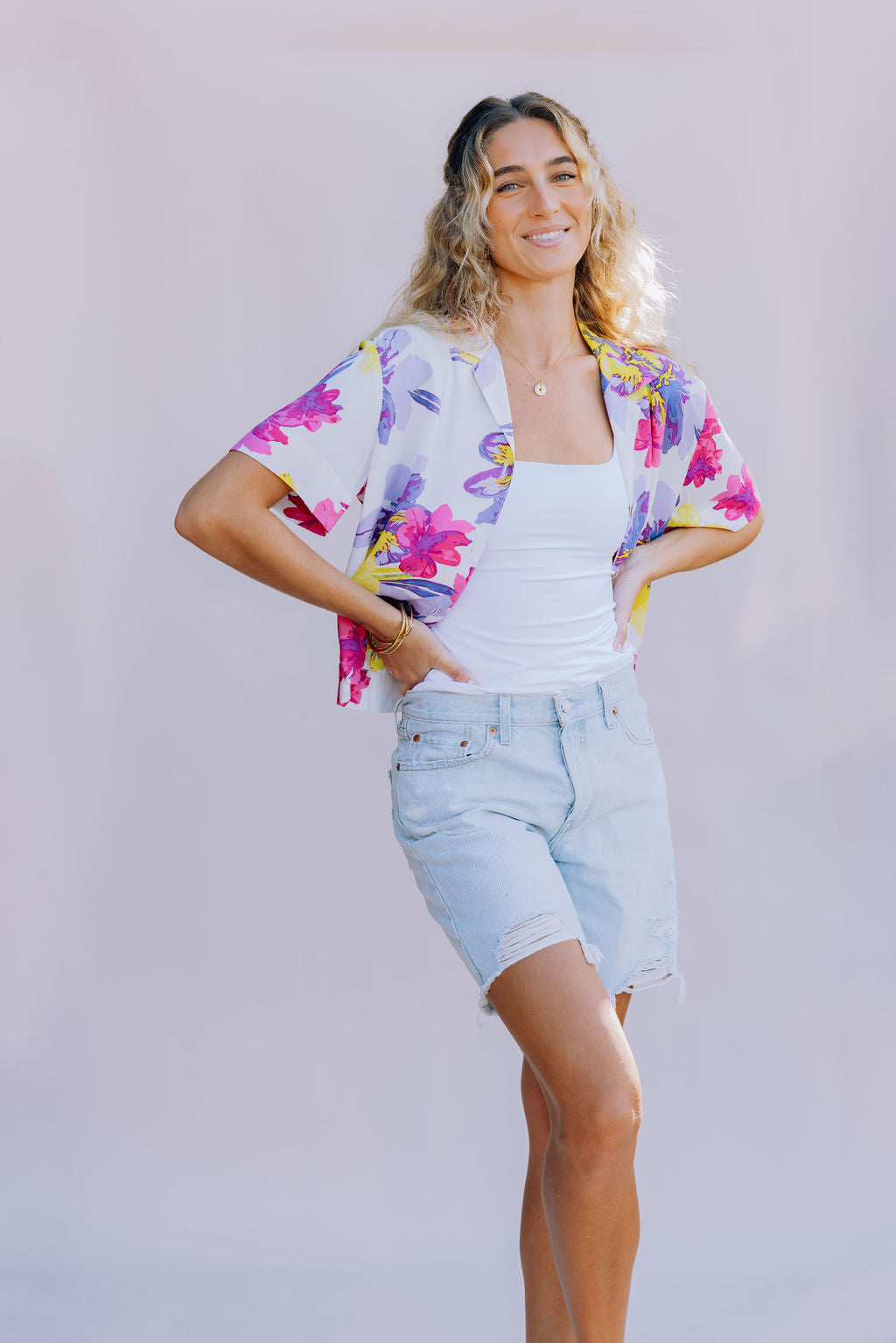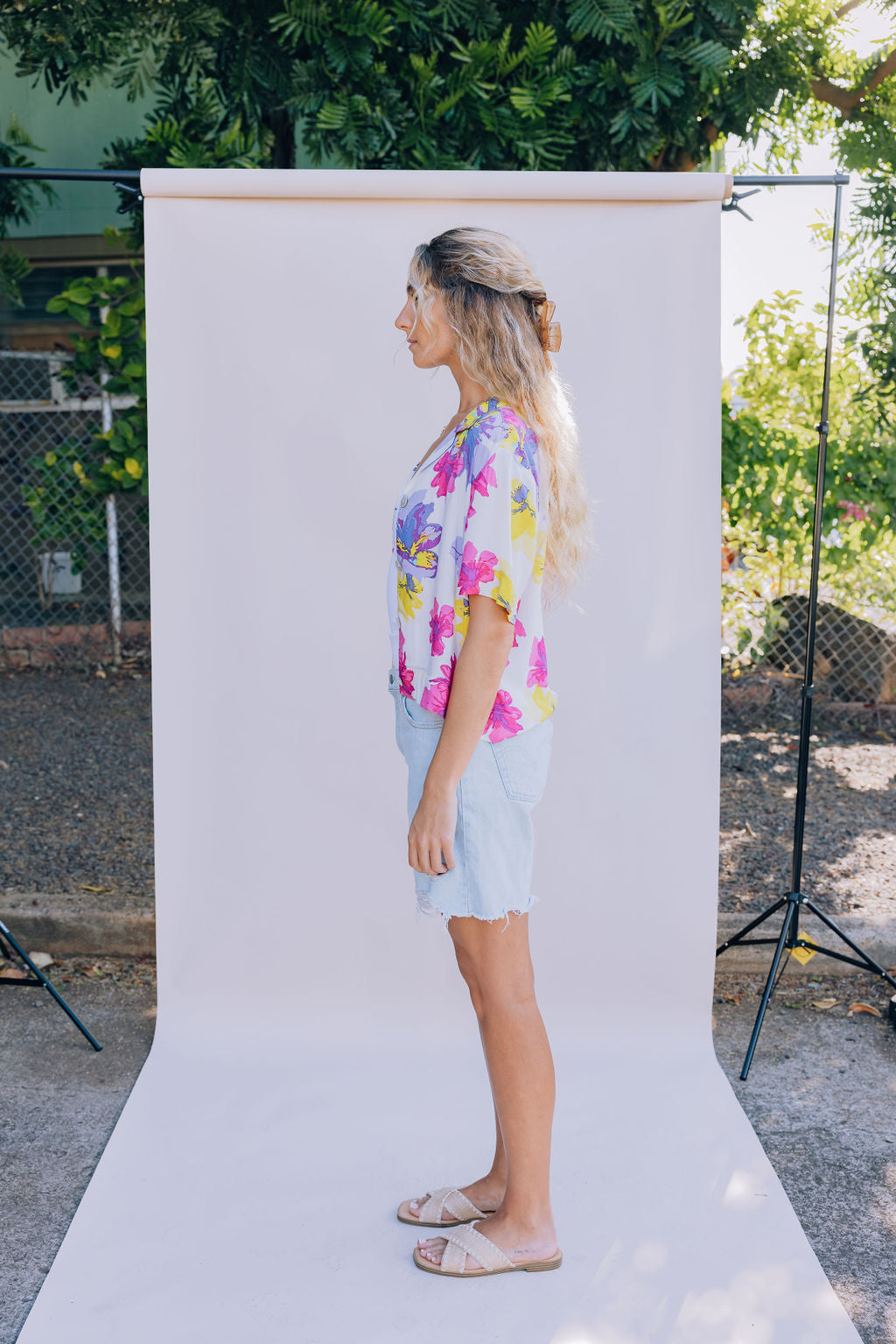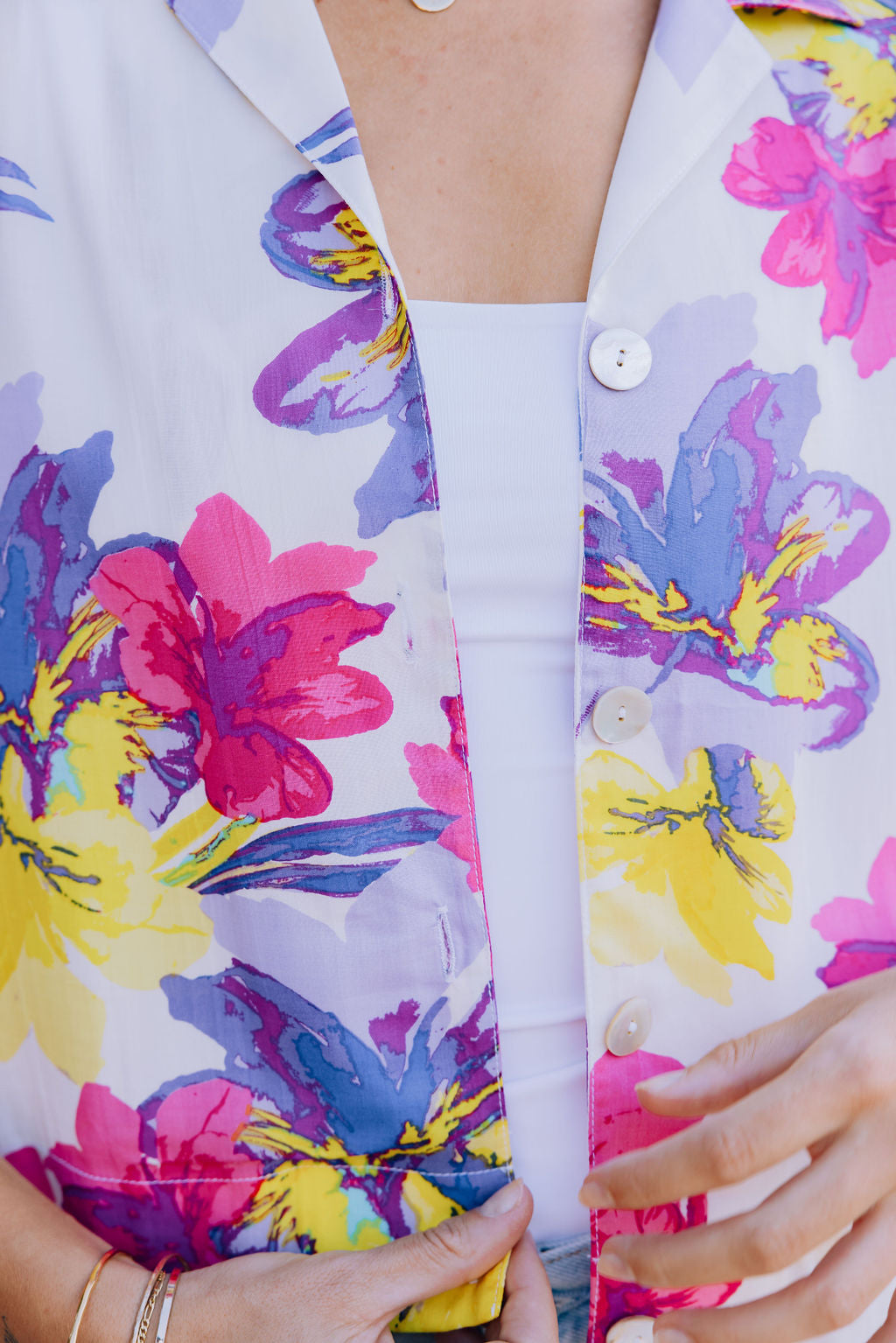 Be bright, vibrant and bold with our newest upcycled print, Retro Bloom. This fun floral design features bright pinks and neon yellows. The perfect fun summer shirt! Wear buttoned up with your favorite pair of denim or try unbuttoning it over a tank or dress for a layered look.