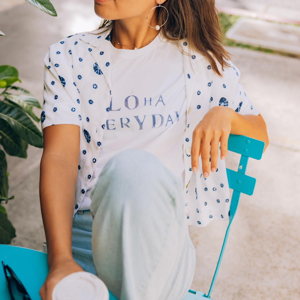 Look easy, breezy, beautiful in this shell inspired button up shirt by Black Point Company. Which features a beachy indigo and white design that is sure to make a statement. Wear buttoned up with your favorite pair of denim or try unbuttoning it over a tank or dress for a layered look.