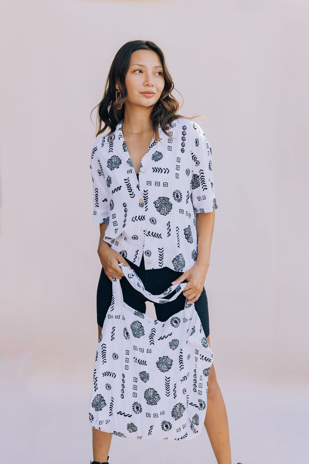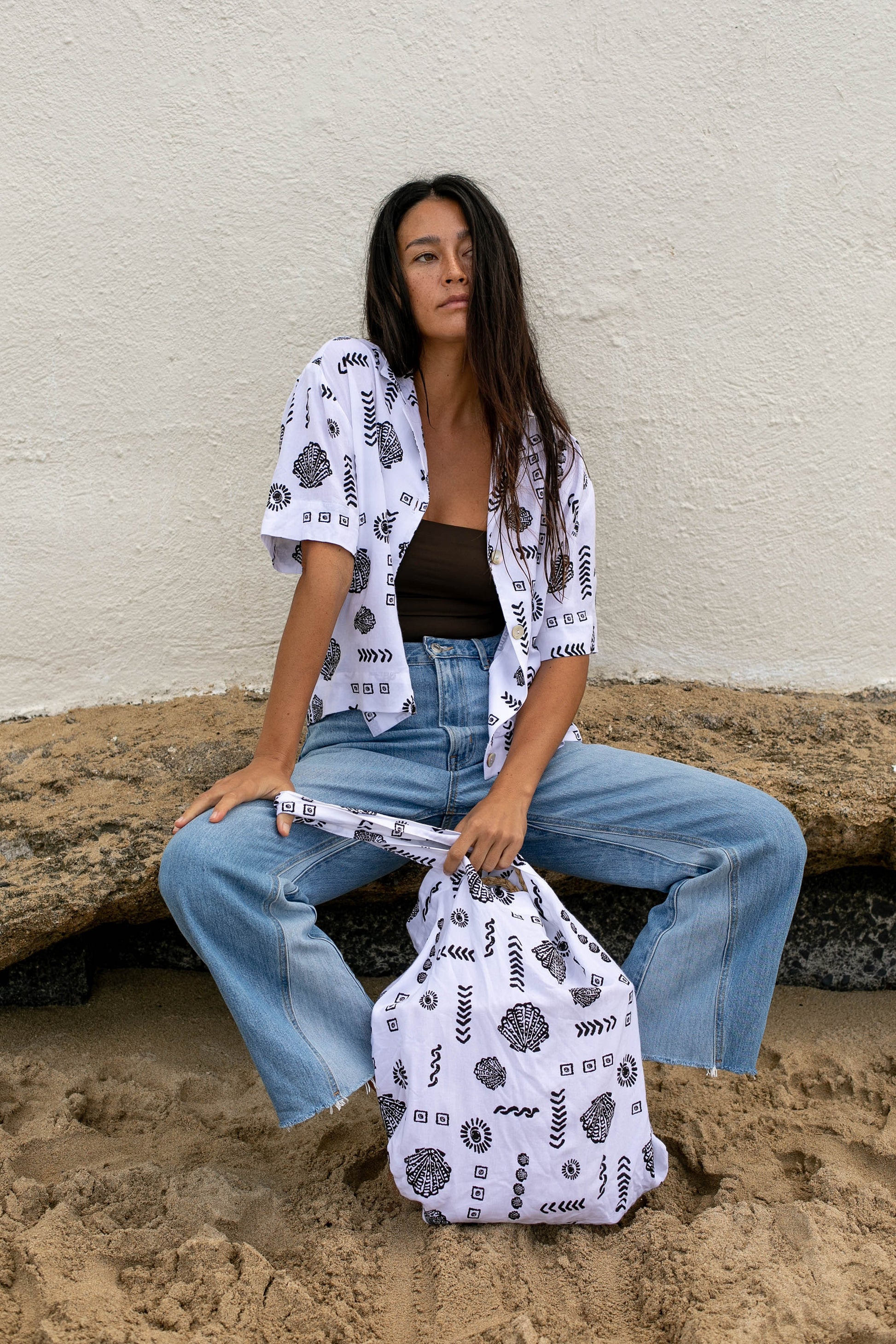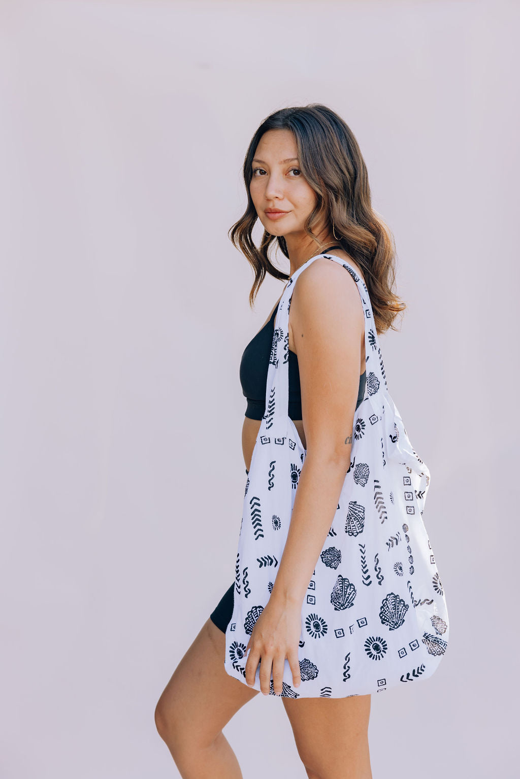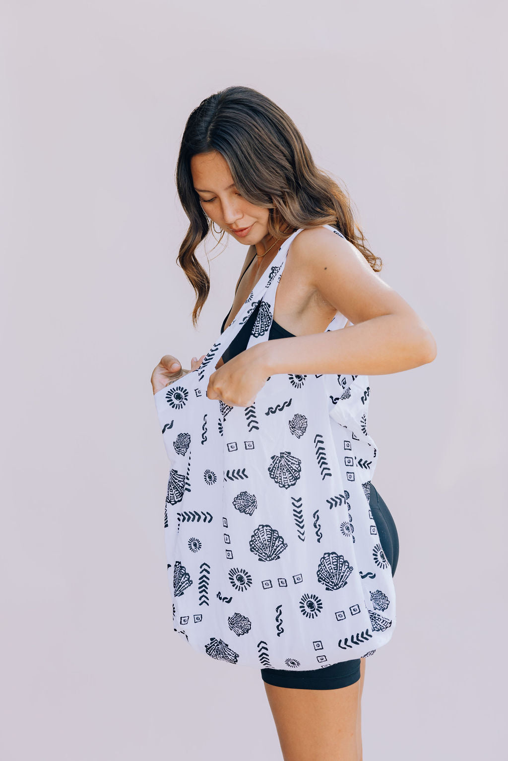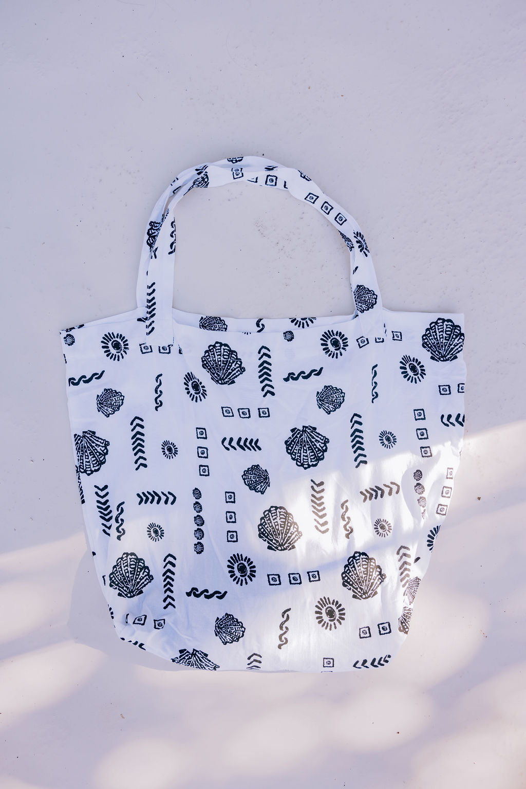 Inspired by long summer days at the beach. We've designed a large enough tote bag to carry all your essentials! Fits towels, makeup bags, and swimsuits galore! This fun seashell summer graphic print makes for a fun addition to your tote collection. Make a statement with this cool printed tote bag on your shoulder!