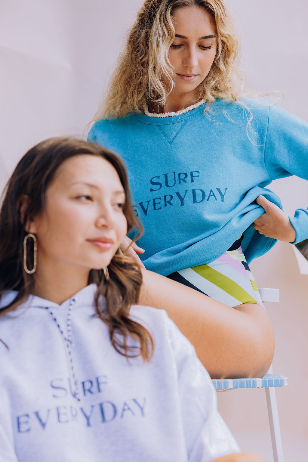 Hand Stamped on our signature eco-friendly fleece material with a vintage inspired silhouette. Our sweatshirt is so comfy you will never want to take it off. The perfect pre/post surf sweatshirt to have with you everyday. Bright Blue to keep your energy high!